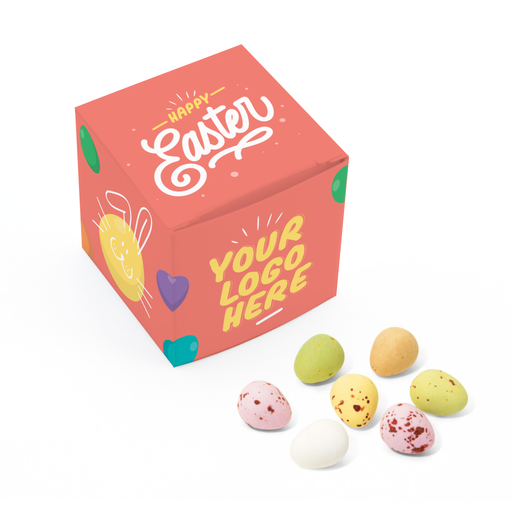 Our fully recyclable Eco Maxi Cube is filled with Speckled Eggs and can feature your design on every surface of the packaging.