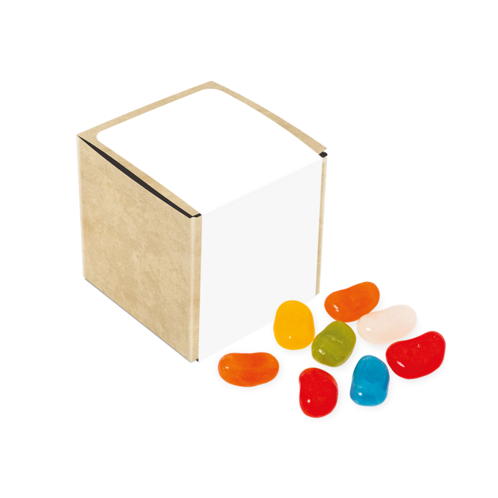 A Eco Kraft Cube filled with Jolly Beans. Branded with a full colour paper semi-gloss wrap.