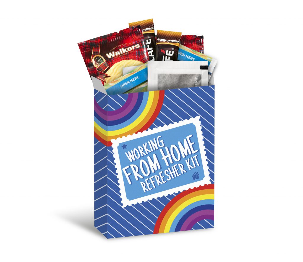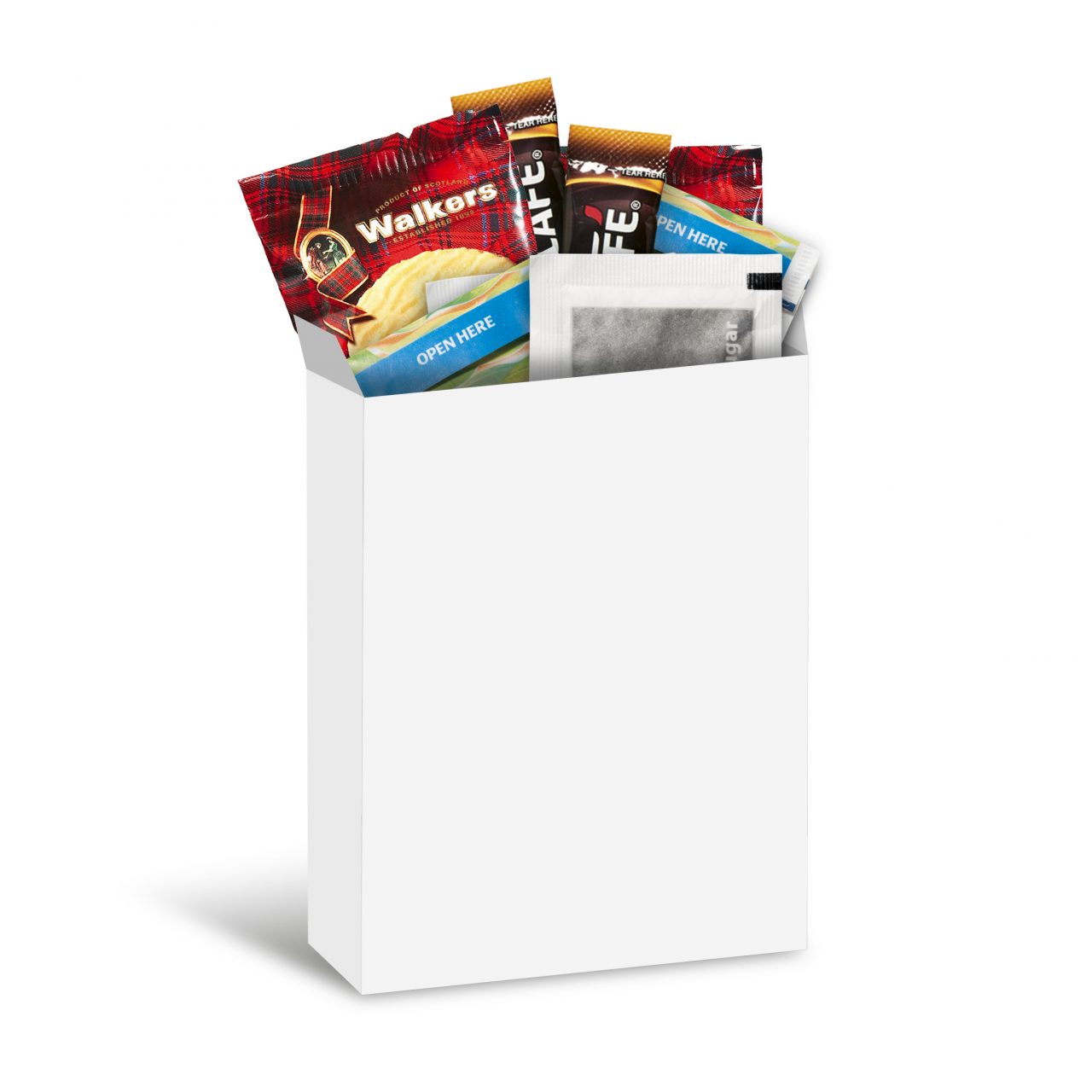 A smart, digitally printed box comes filled with x2 Tetley Tea, x2 Nescafe Coffee Sachet, x2 Sugar Sachet and x2 Walkers Mini Shortbread Biscuit. (Please note: The box is eco-friendly but some items inside may not be, yet!)